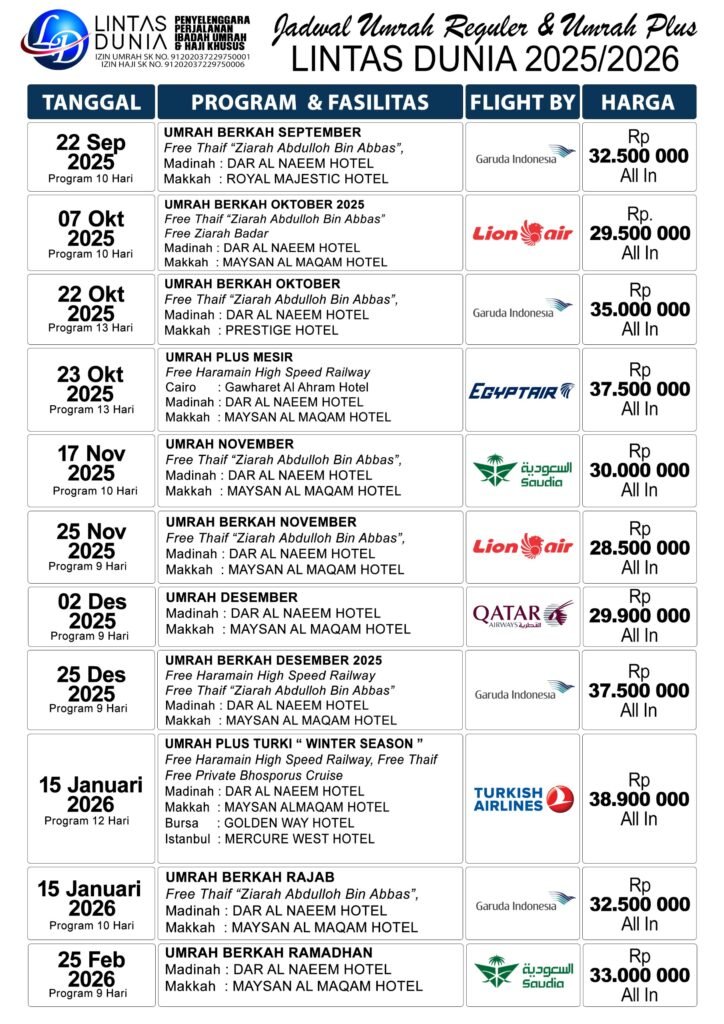 Niat yang kuat untuk pergi umroh terus menggebu dan seperti sudah terasa hawa kota yang selalu dirindukan Mekkah dan Madinah. Mencari dan bertanya info mau pakai travel agent mana. Dan Alhamdulillah pilihan jatuh ke PT. Lintas Dunia yang kebetulan sedang ada promo Umroh plus Turki program 15 hari pula. Alhamdulillah tidak salah pilih dan merasa sangat puas sekali. Dari hotel, akomodasi dan kuliner serta destinasi wisata juga guide lokal selama d Turki sangat memuaskan. Istambul, Kayseri, Cappadocia dg safari jeep tour dg sunset yg sungguh indahnya MashaAlloh. Begitu juga d Madinah dan di Mekkah kami merasa dilayani dengan baik. Dari sisi Hotel, akomodasi juga city tour, para Muthowif yang baik juga Ustadz yang membimbing ibadah Thowaf dan Sai dan bertanggung jawab dalam mengurus segala hal. Terimakasih PT. Lintas Dunia yang sudah melayani jamaah dengan sangat baik. Juga silaturahminya bisa berjalan dengan baik pula. InshaAlloh kami bisa ikut dan bergabung lagi dengan program2 yang lainnya. Aamiin YRA Sekali lagi terimakasih PT. Lintas Dunia semoga tambah berkah sesuai dengan slogannya. Salam sehat selalu.